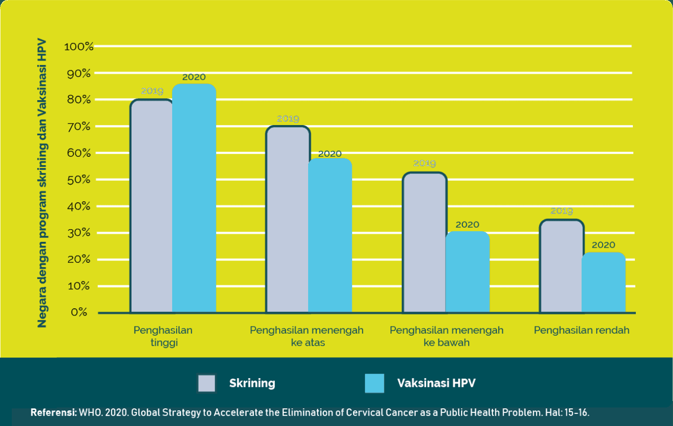Lalu pada tahun 2020, kurang dari 25% negara berpenghasilan rendah dan kurang dari 30% negara berpenghasilan menengah ke bawah memasukkan vaksin HPV ke jadwal imunisasi nasional mereka, sementara lebih dari 85% negara berpenghasilan tinggi telah melakukannya.
