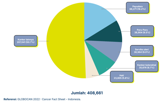 Angka kasus kanker payudara mencapai 16,2% dari keseluruhan kasus kanker di Indonesia. Lalu, ada kanker paru-paru sebanyak 9,5%, ketiga serviks uteri mencapai 9,0%, kanker kolorektal sebanyak 8,7%, kanker hati sebanyak 5,8% dan kanker lainnya 50,7%.