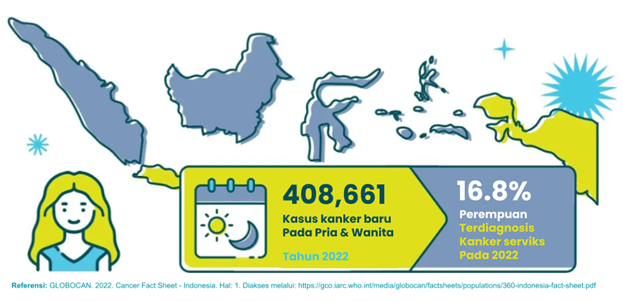 Berdasarkan data dari GLOBOCAN, jumlah kasus kanker baru (pria dan wanita) di Indonesia mencapai 408,661 pada tahun 2022, meliputi: kanker payudara (16,2%); kanker paru-paru sebanyak 9,5%: kanker serviks uteri (9,0%): kanker kolorektal (8,7%), kanker hati (5,8%), kanker lainnya (50,7%).